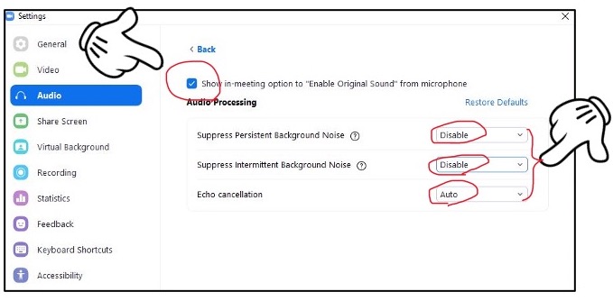 4. Check the box entitled, “Show in-meeting option to “Enable original sound” from microphone.